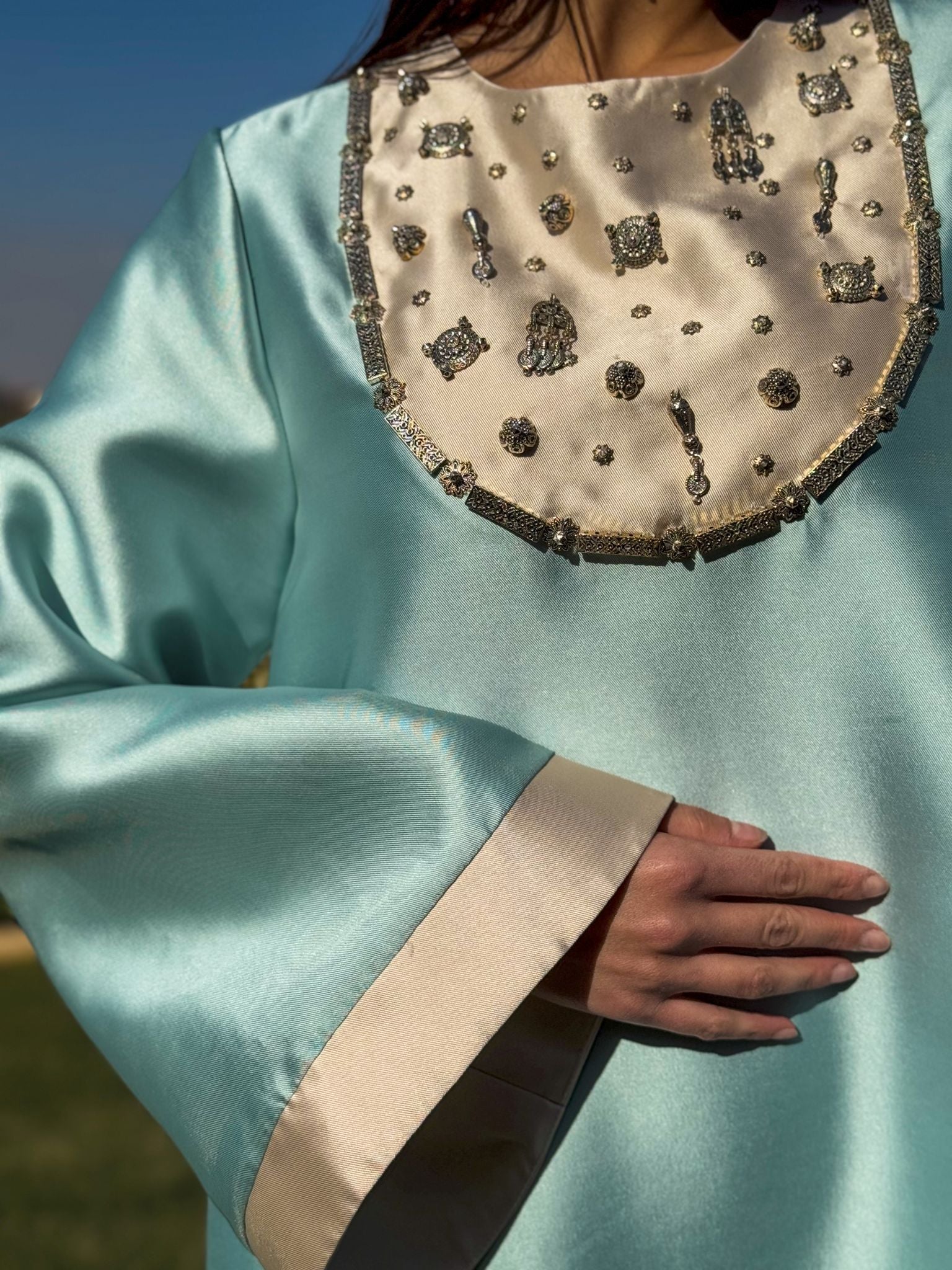 Adonrned with rich silver embellems to each their own significance to heritage, this gown features an exquisite twist with the contrasting neckline colors and fabrics that blend so effortlessly. In a clean A-line cut this gown, this gown blends comfort and ultimate elegance with a statement perfect for gatherings and occasions